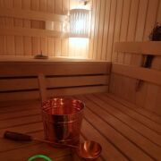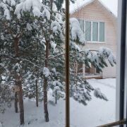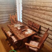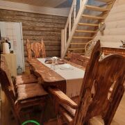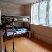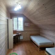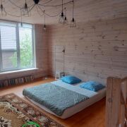 В гостевом доме на 1- м этаже общ.площадью 51м2 находится терраса 10м2, баня с большой парной ( 2.5на 3 метра), закрытой каменкой облицованной натуральным камнем змеевик, липовая вагонка и полки, вентиляция басту, гостинная, душевая и санузел. На 2-м этаже две жилые комнаты, общ площадью 50м2.