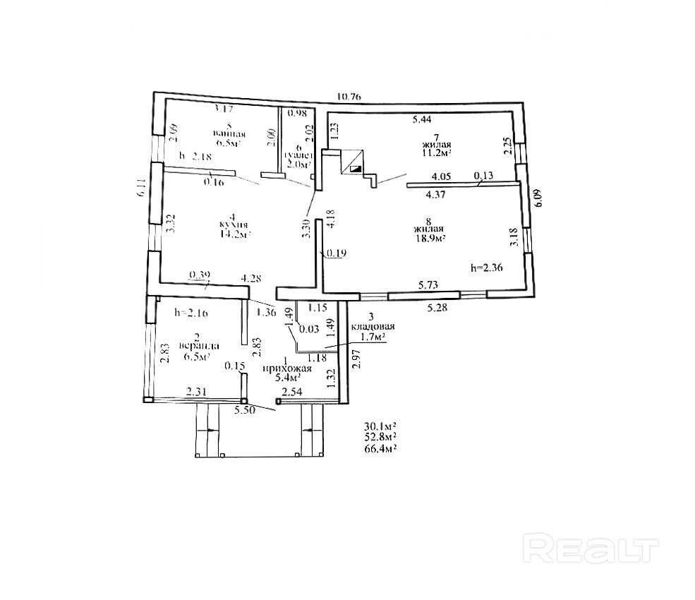 Общая площадь дома: 52.8 м2 (по СНБ – 66.4 м2); жилая площадь: 30.1 м2.