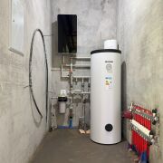 Дом подключен к центральному водоснабжению, но также дополнительно на участке имеется собственный колодец. Канализация – автономная (станция биологической очистки) KANN Ultra 5. Установлен современный электрический котел, с возможностью управления через wi-fi, мощностью 14 киловатт (по льготному тарифу), который работает в паре с бойлером косвенного нагрева на 140 л. Отопление в гостиной, коридоре и санузлах организовано через систему