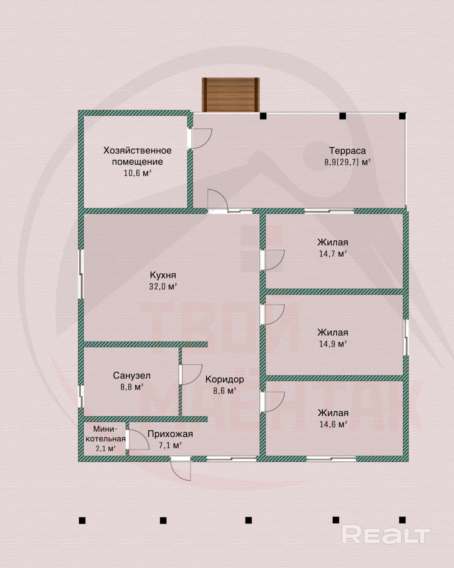 Продается новый современный дом с хорошо продуманной, ориентированной на максимальное использование полезного пространства планировкой. В проекте предусмотрена просторная гостинно-кухонная зона (32 м2), три спальных комнаты (14,6; 14,7; 14,9 м2), прихожая с коридором (7,1; 8,6 м2), а также отдельная котельная. Выход на террасу организован из гостинно-кухонной зоны, с лицевой стороны дома имеется вторая терраса.
