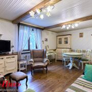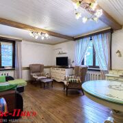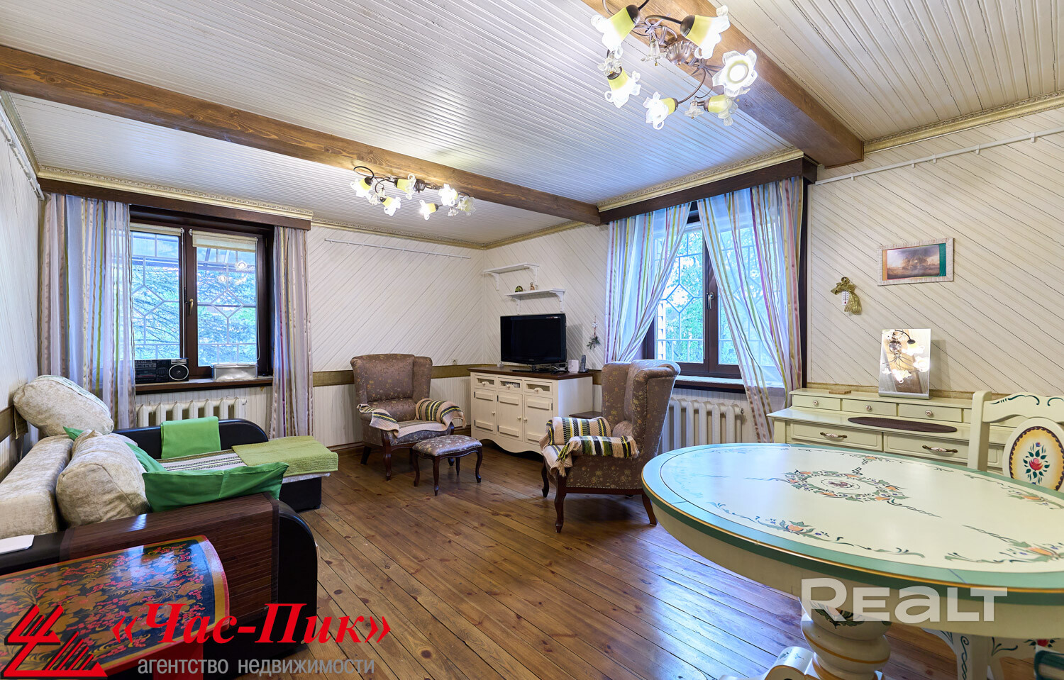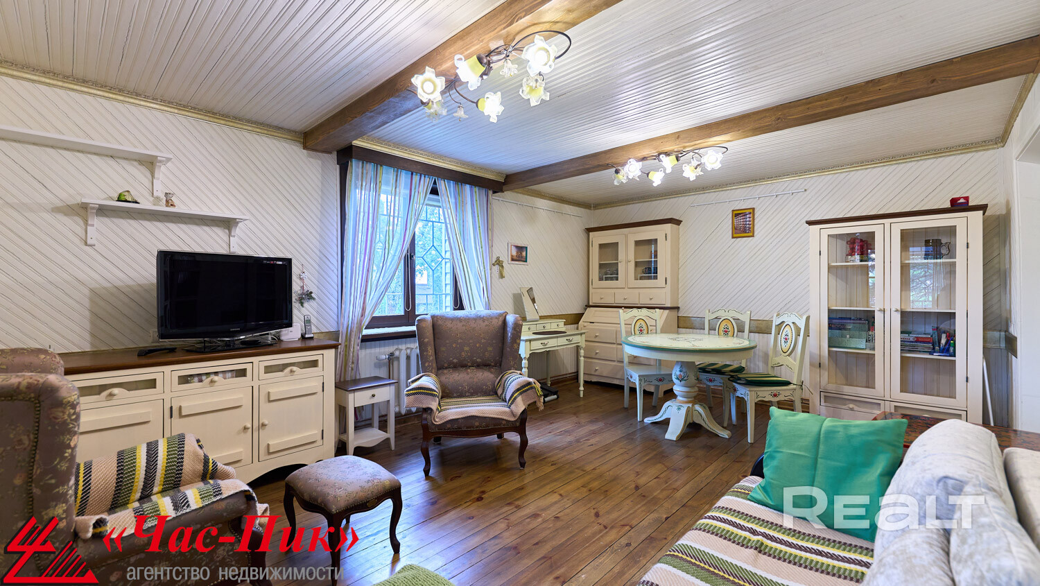 👉Гостиная: 2 окна, шторы, деревянные балки, пол - дерево, стены и потолок = белая  крашеная вагонка + декоративные карнизы, люстры - 2шт, шторы, ТВ, диван 3-х местный Раздвижной, 2 кресла, буфет, Книжный Шкаф, комод, комплект деревянные обеденный стол + 4 стула, система для навески картин