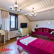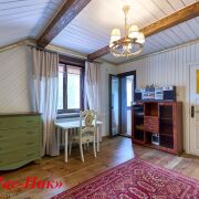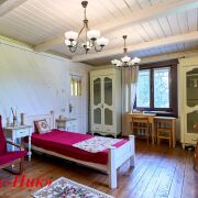 👉Спальня 2: деревянные балки, пол - дерево, стены и потолок = белая  крашеная вагонка + декоративные карнизы, 1 окно, карниз, шторы, люстра. Мебель из натур. дерева: шкаф 2-х створчатый, комоды с ящиками - 2шт,  стол, тумба - витрина. ТВ. Лоджия /Кабинет (стеклопакетные дверь+окно, шкафчик, потолочный светильник)