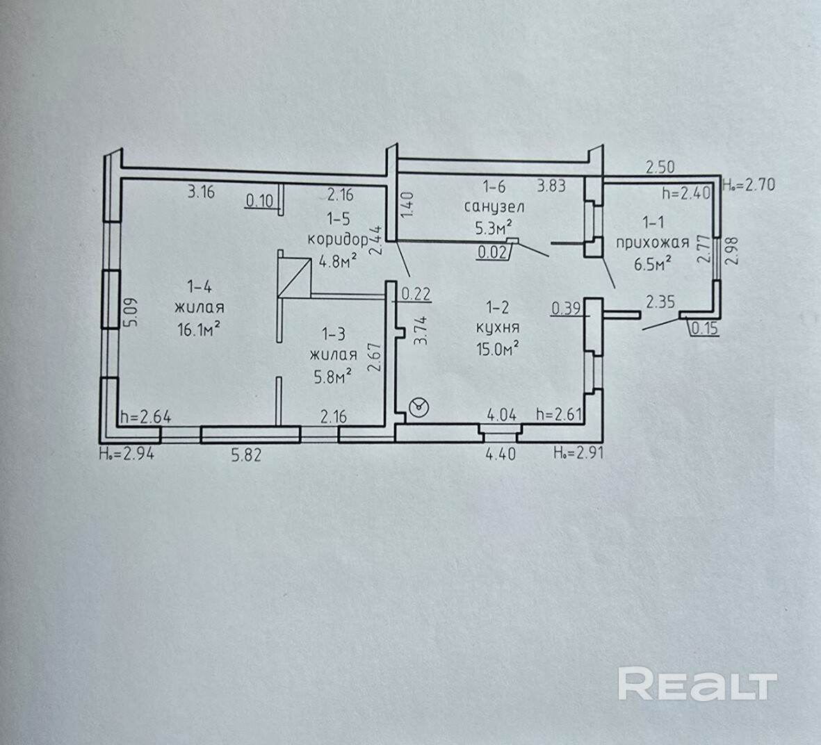 Общая площадь по СНБ: 53.5 кв.м , жилая площадь: 21,9. Высота потолков 2,61