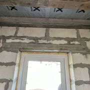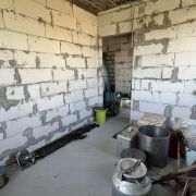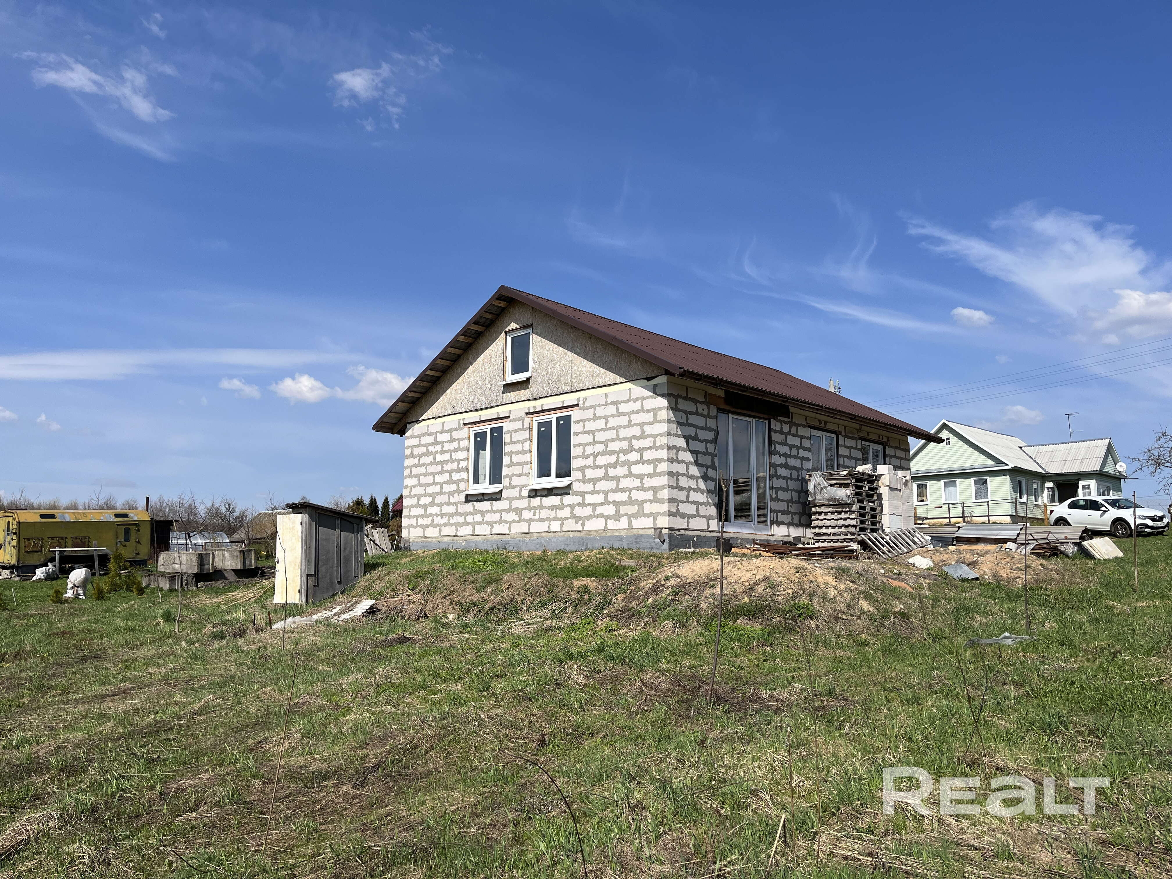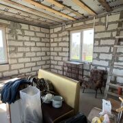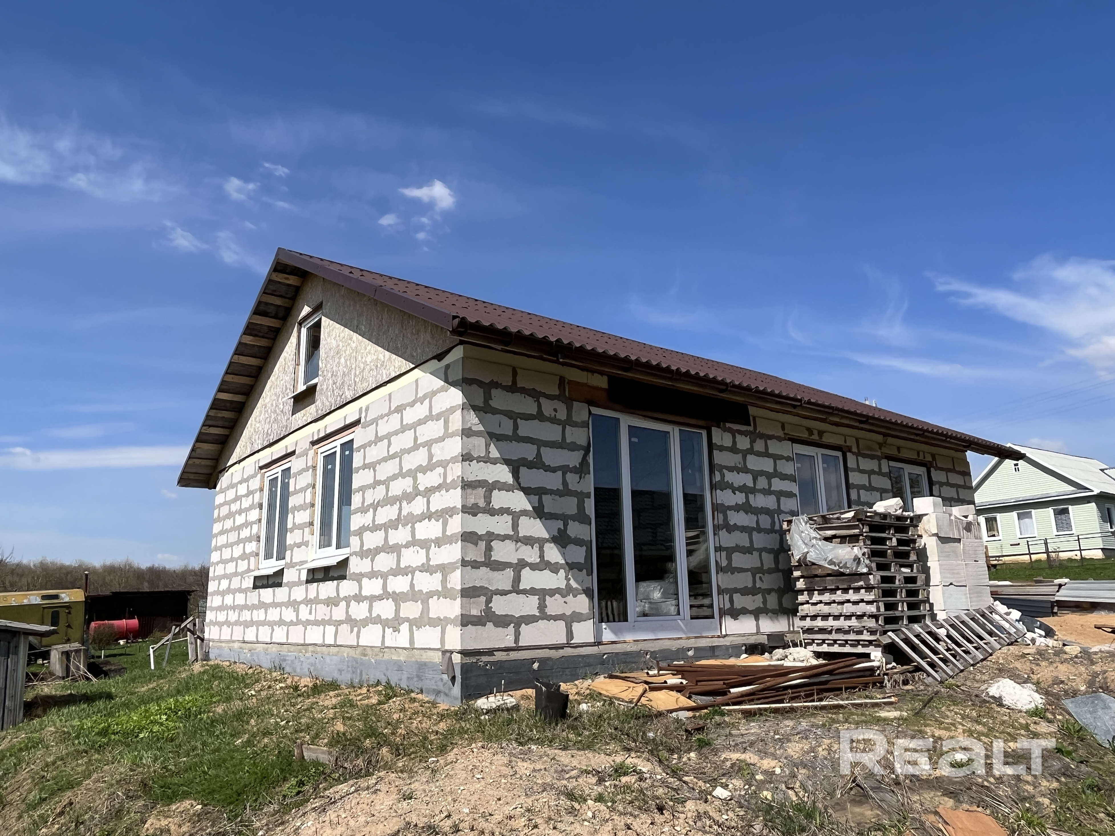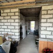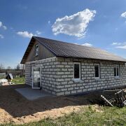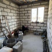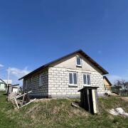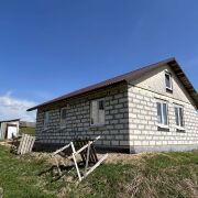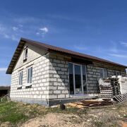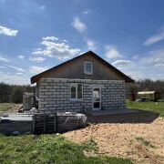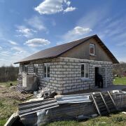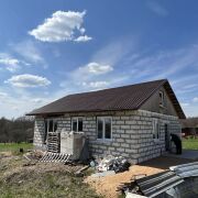 Дом - готовность около 40%. Фундамент ленточный бетонный, стены – газосиликатные блоки, перекрытия деревянные, кровля из металлочерепицы, фронтоны ДСП.