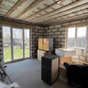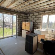 Установлены стеклопакеты, двери. На полу бетонная стяжка. Сделана разводка под теплый пол.
