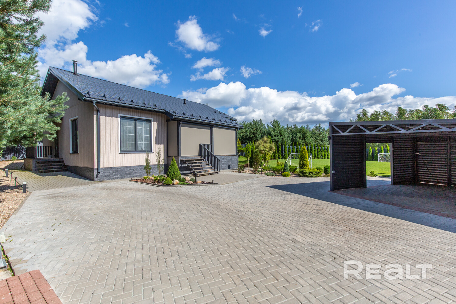 Несомненный плюс этого дома – грамотная функциональная планировка. З изолированные комнаты, к хозяйской спальне примыкает гардеробная. И 38-миметровая кухня-гостиная-столовая, оборудованная всей необходимой мебелью и техникой с выходом на 20-тиметровую террасу. На террасе установлены 4 маркизы с электроприводом.