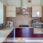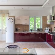 Кухонная зона оборудована встроенной кухней, варочной газовой панелью, духовым шкафом и посудомойкой Ariston, холодильником LG, обеденным столом со стульями, диваном и встроенным шкафом. Светильники и люстры передают хорошее световое решение объекта. Смесители производства Hansgrohe и сантехническое оборудование производства Cersanit. Приточно-вытяжная система по дому.