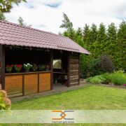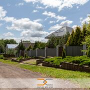 Участок 18.8 соток разделен на 2 зоны. 1-ая зона: лужайка, цветники, мини водоем, качели, зона барбекю в виде крытой беседки, 2-ая зона - хозяйственная, с теплицами и русской баней на дровах с парилкой, садом. По периметру участка высажены туи, что обеспечивает очень комфортное и приватное пребывание на территории дома.