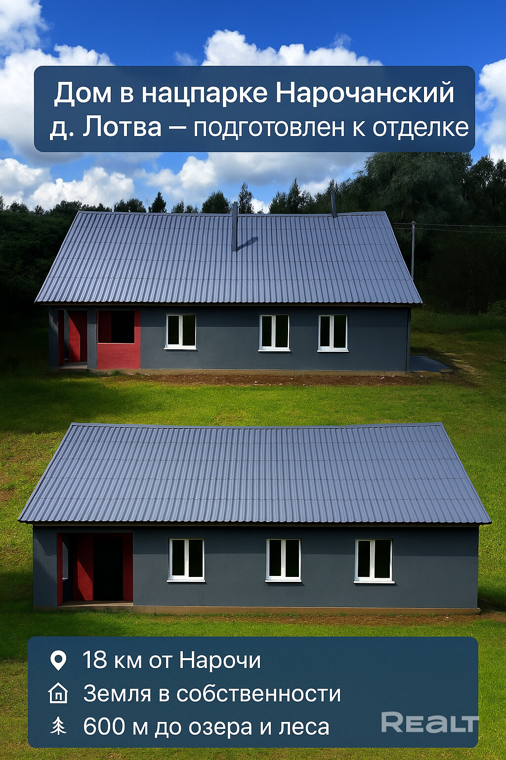 Продается дом в скандинавском стиле в нацпарке "Нарочанский", д. Лотва. Земля в собственности. Дом подготовлен к отделке: новые окна, стяжка пола, водопровод, электрика, покрашен фасад и крыша, шпатлевка стен. Участок выровнен, сад, сруб, сарай, погреб. 600 м до озера и леса. Льготные тарифы на воду и отопление. Рядом добрые соседи.📞 Звоните и приезжайте посмотреть! Дом готов к финишной отделке — вложено уже всё самое дорогостоящее! Отличный вариант для дачи, ПМЖ, сдачи в аренду или инвестиций.