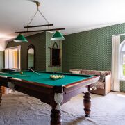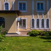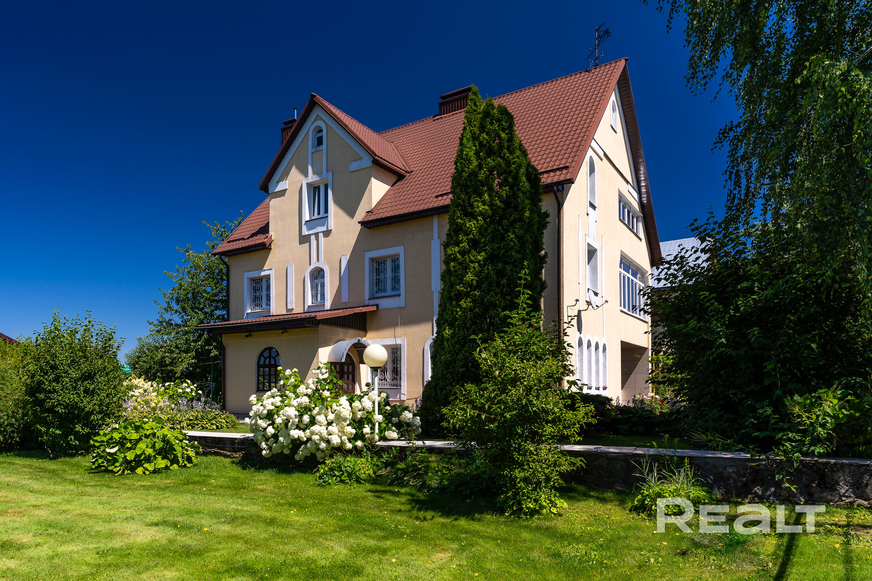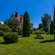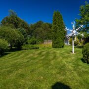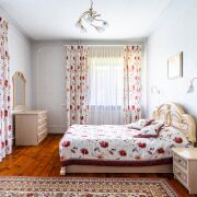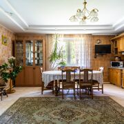 Благоустроенный участок перед домом, а задний двор словно растворяется в зелени и тени деревьев. На территории обустроен собственный пруд с рыбой и даже французскими лягушками. Включает в себя сад, огород и баню. Внутреннее убранство выдержано в классическом стиле, отличающемся сдержанностью и мягкой палитрой. Просторные комнаты, высокие потолки создают ощущение свободы.