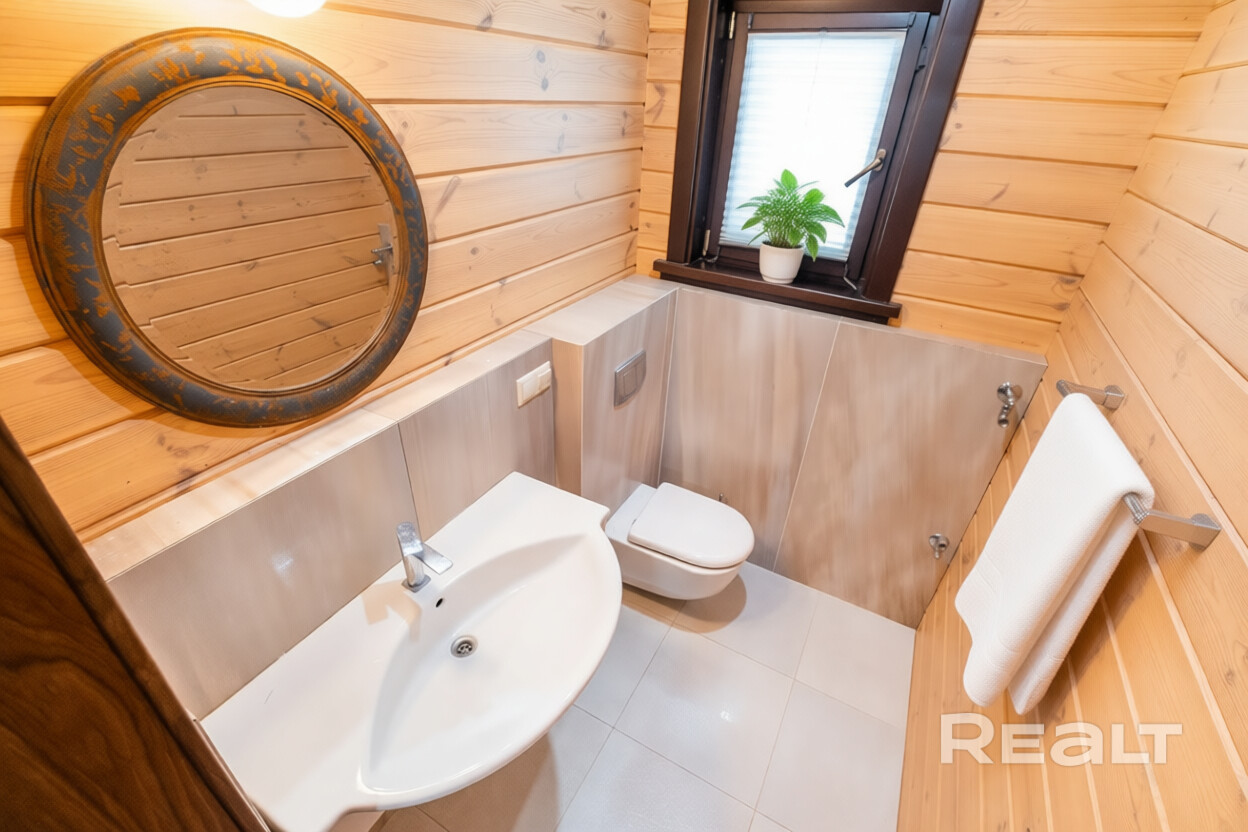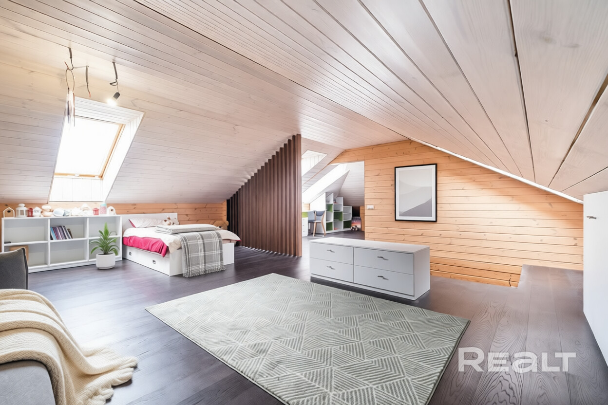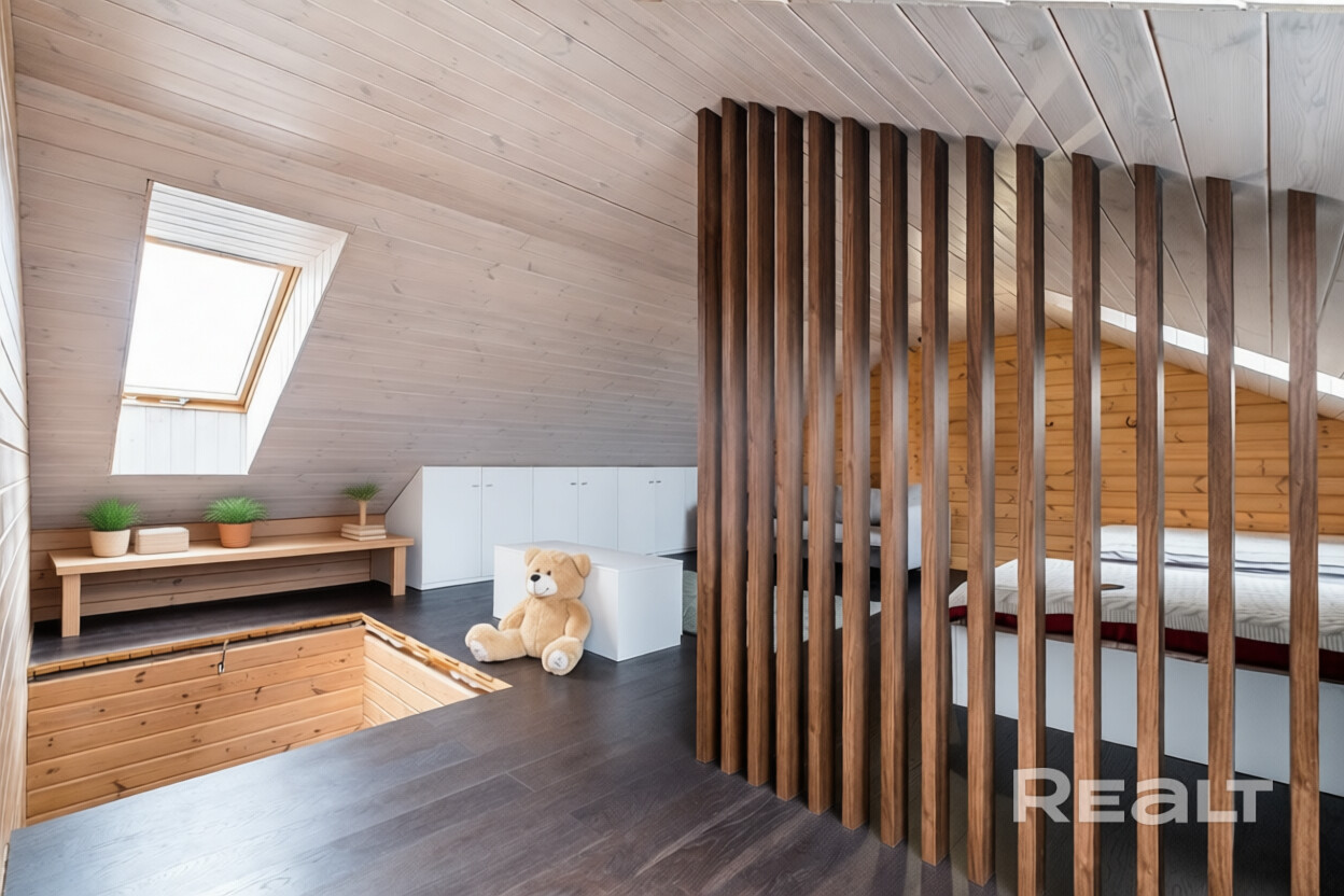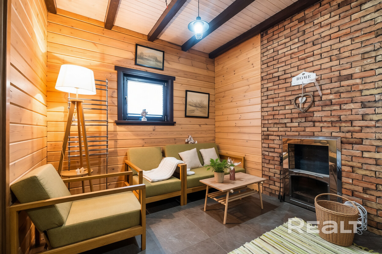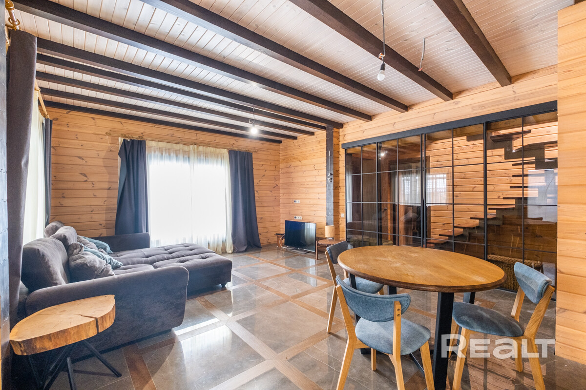 Просторная кухня гостиная, два санузла, душевая, комната отдыха с камином, русская баня, а также запроектирована купель. На полу выложена плитка (Италия), паркет (Германия), тёплый пол, стены окрашены виниловые краской, установлены двери и перегородки (Италия). На мансардном этаже жилая комната 43 кв.м. с гардеробной комнатой. Стильная технология «второй свет» визуально увеличивает площадь, делает пространство «воздушным» и позволяет экономить на электроэнергии за счет большого количества естественного освещения. Пол - паркет, стены - виниловые окраска.