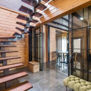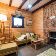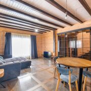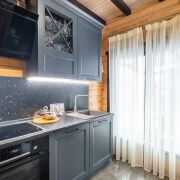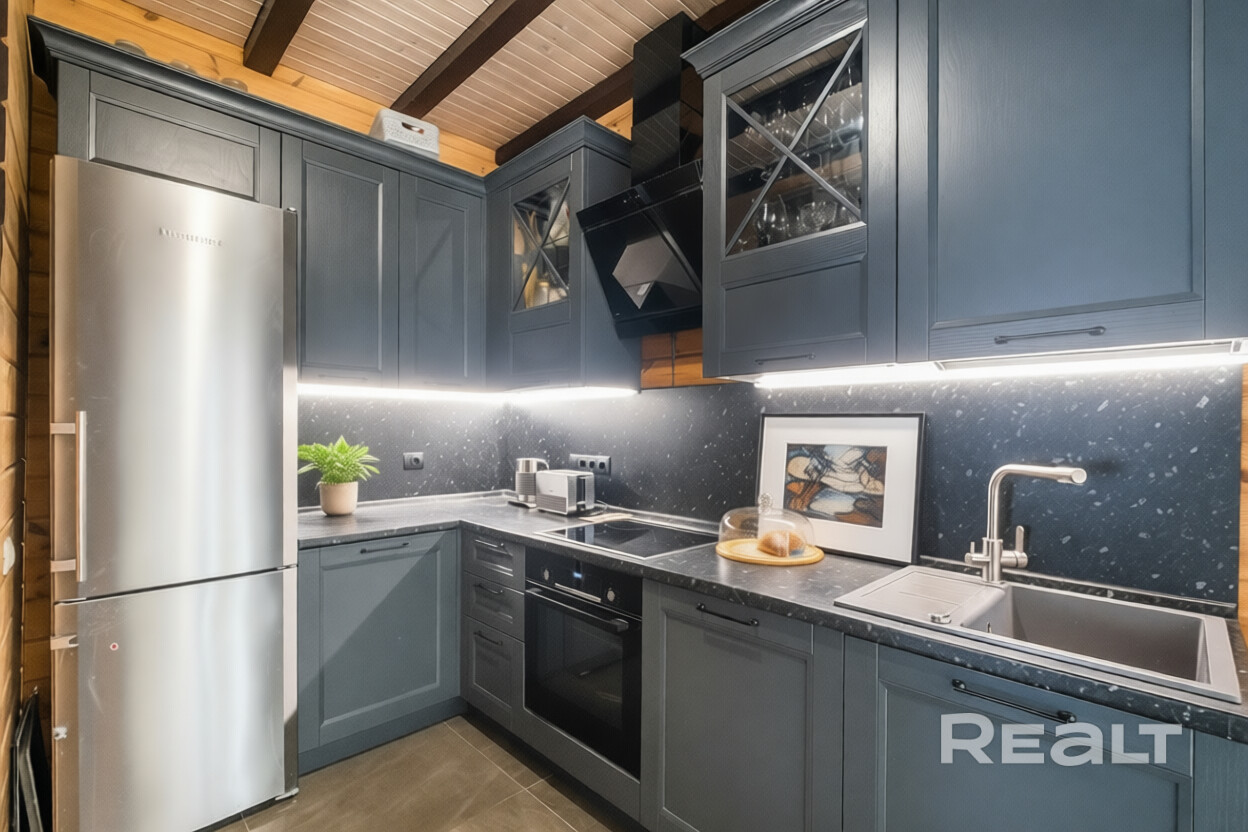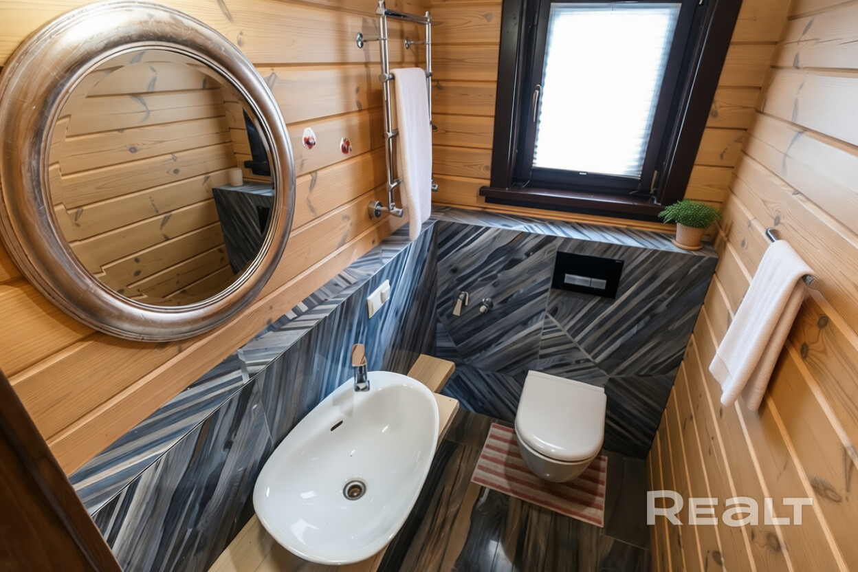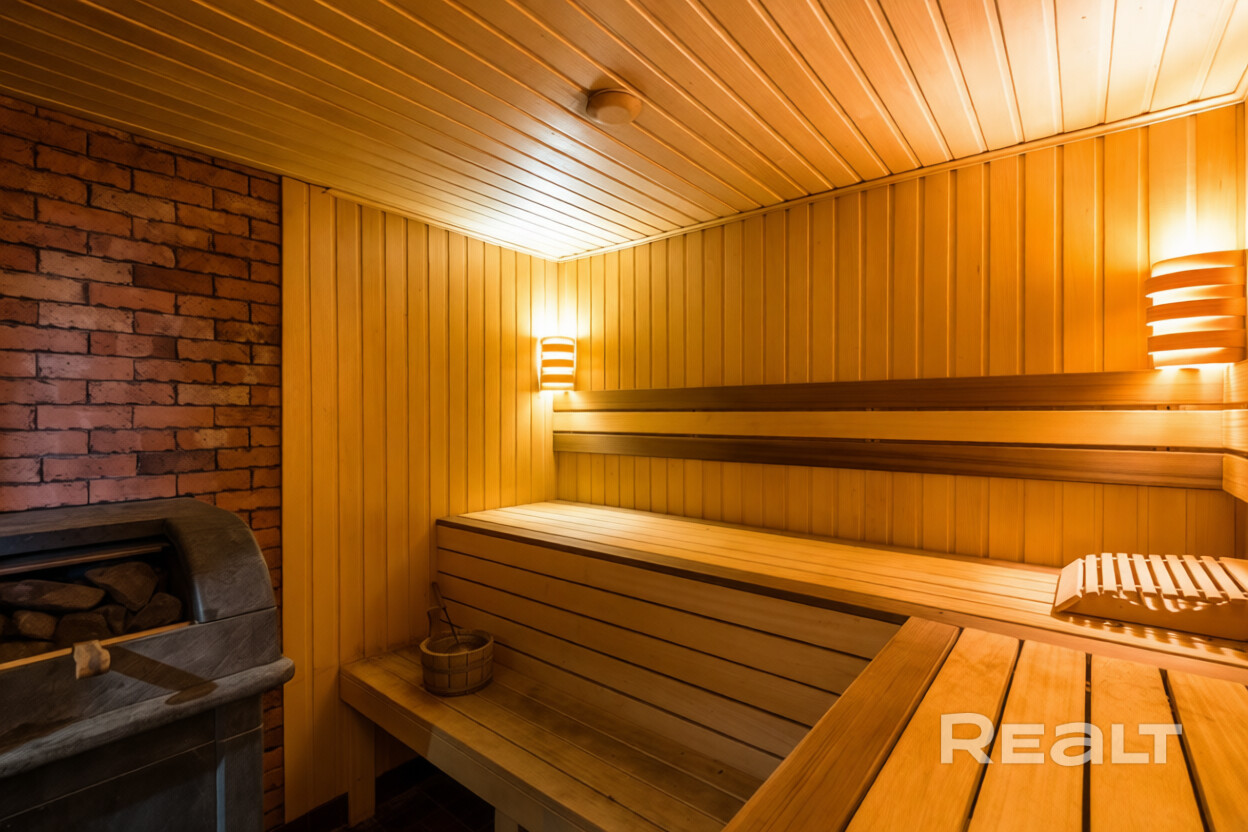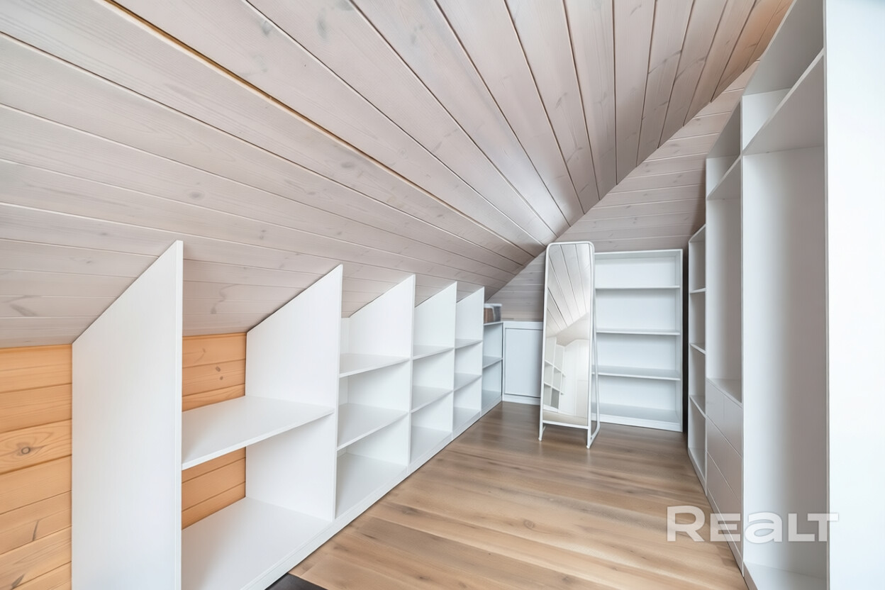 Просторная кухня гостиная, два санузла, душевая, комната отдыха с камином, русская баня, а также запроектирована купель. На полу выложена плитка (Италия), паркет (Германия), тёплый пол, стены окрашены виниловые краской, установлены двери и перегородки (Италия). На мансардном этаже жилая комната 43 кв.м. с гардеробной комнатой. Стильная технология «второй свет» визуально увеличивает площадь, делает пространство «воздушным» и позволяет экономить на электроэнергии за счет большого количества естественного освещения. Пол - паркет, стены - виниловые окраска.
