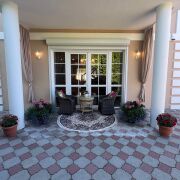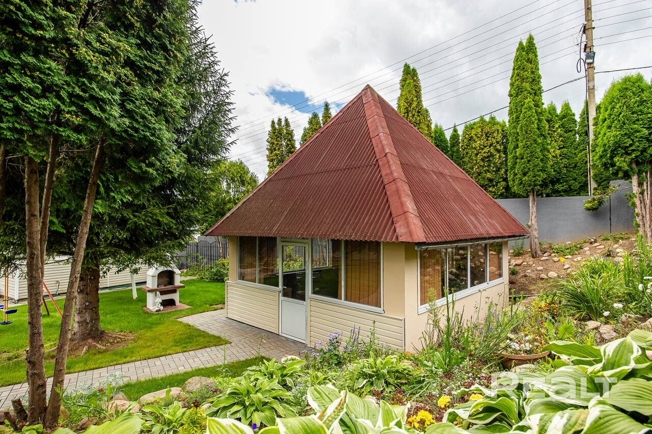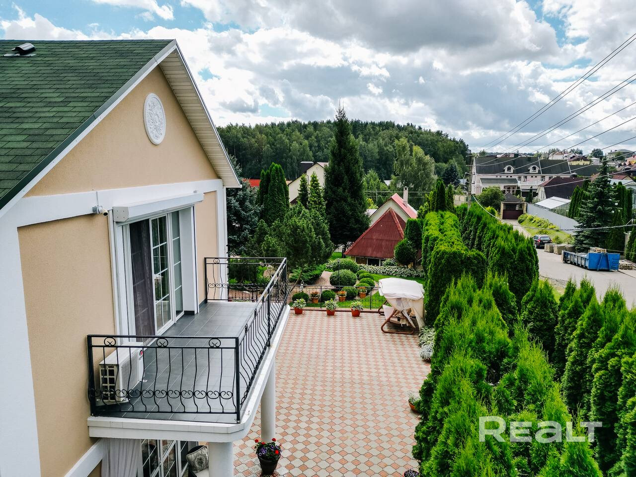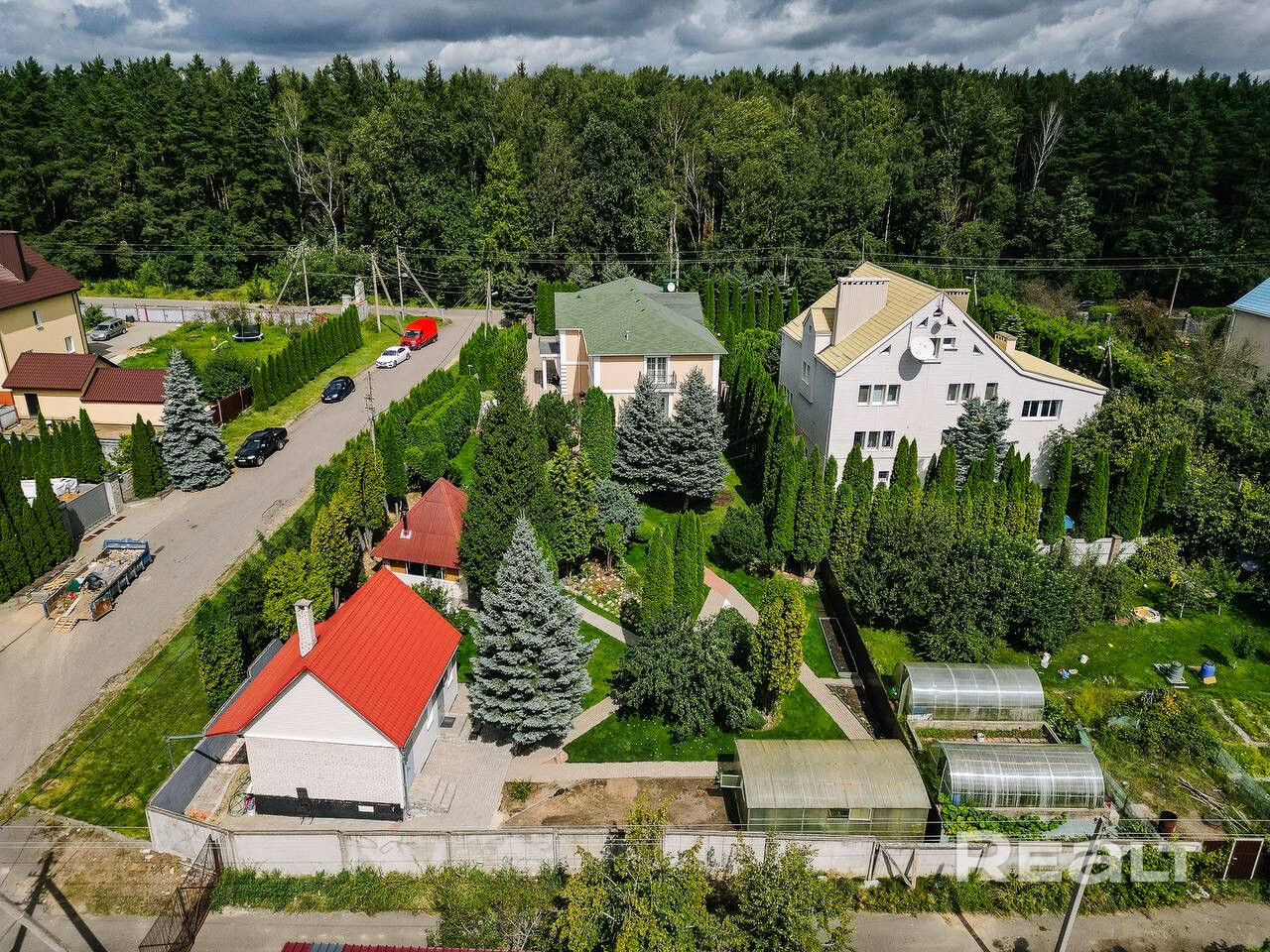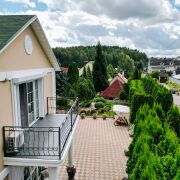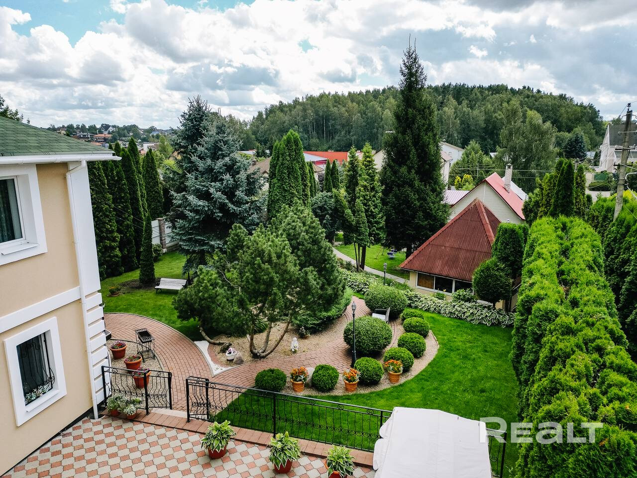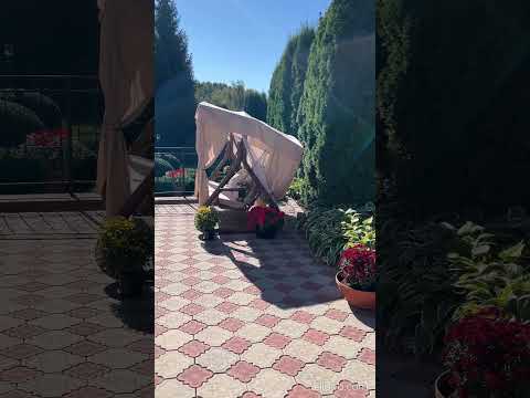 • Просторный участок с зелеными насаждениями: высокие туи,голубые ели,декоративные кустарники,цветы