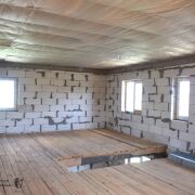 На 1 этаже бетонная стяжка, утепление 100 мм пенополистиролом. На 2 этаже доска 35 мм. Межэтажное перекрытие утеплено минватой 100 мм, проложена пароизоляция.