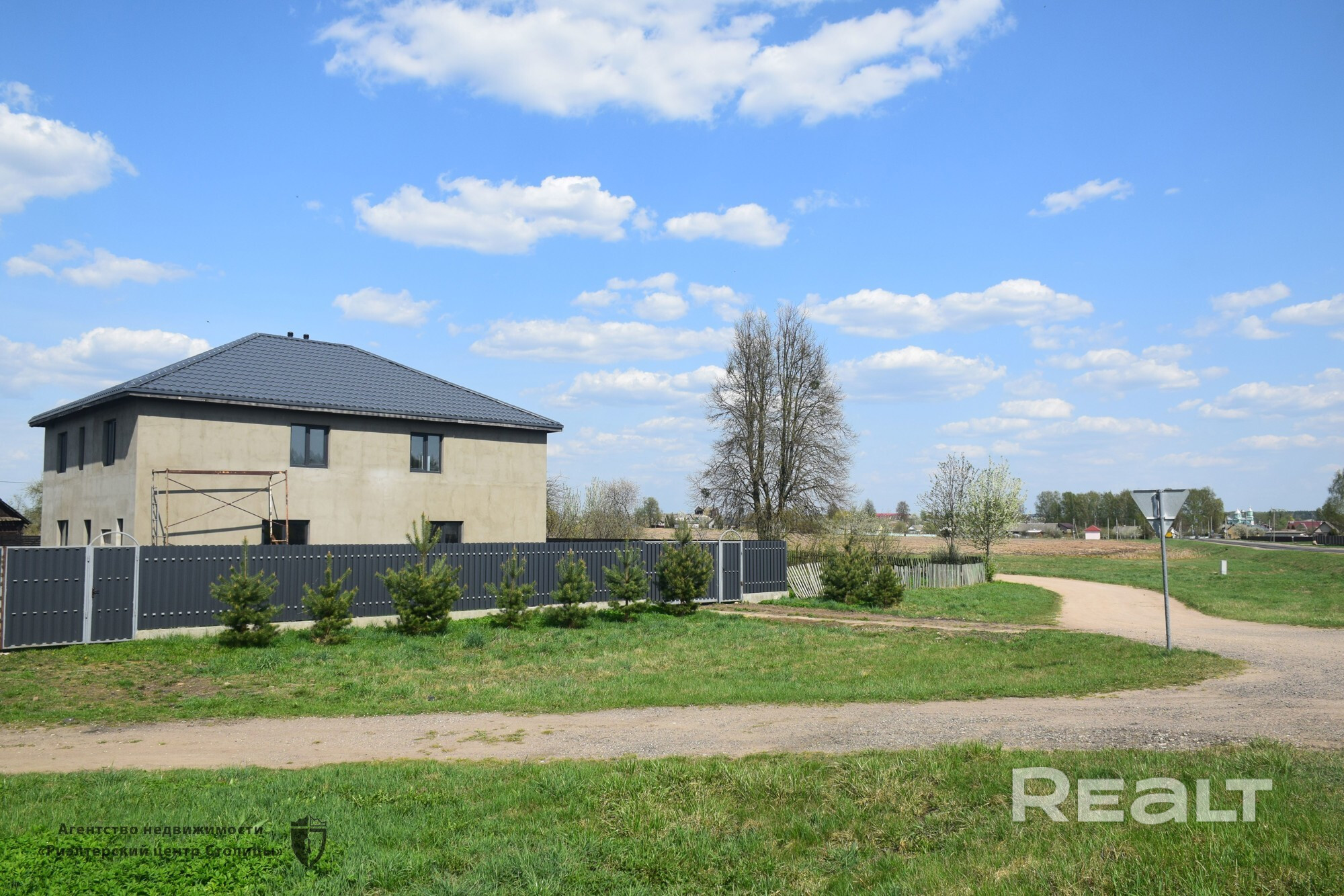 Перед участком высажены сосны, до асфальта 10 м.