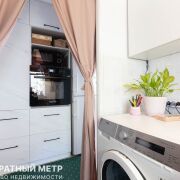 Вместительная гардеробная (4.8 м2) с постирочной зоной. Здесь установлена оригинальная немецкая техника AEG (стиральная и сушильная машины), есть столик для макияжа или рабочее место.