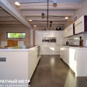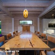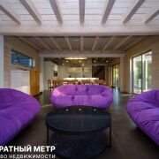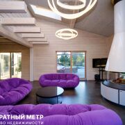 Акцентная мебель: в гостиной – конусный дровяной камин и фиолетовые модельные диваны; в столовой зоне – длинный обеденный стол из массива дерева; в зоне с кухонным оборудованием – удобный L-образный гарнитур с кухонным островом; в спальных комнатах – широкие двуспальные кровати с ортопедическими матрасами.