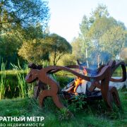 7. Природный зарыбленный пруд с островами, на берегу которого оборудованы: кострище из кованого металла, деревянный настил с лодкой на веслах, веревочные качели, натянут подвесной гамак.