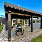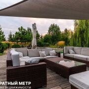 5. Открытая зонированная терраса с садовой модульной мебелью под солнцезащитными навесами из двух теневых парусов.