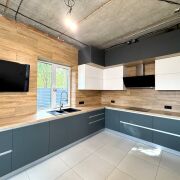 Современная кухня со встроенной мебелью и техникой: посудомоечная машина BOSCH, электрическая варочная панель, вытяжка BOSCH, микроволновая печь, 2-х дверный холодильник, телевизор SAMSUNG, корпус кухни ЛДСП EGGER, кухонные фасады - акрил Niemann, столешница - постформинг EGGER, фурнитура – BLUM, дизайнерский обеденный стол.