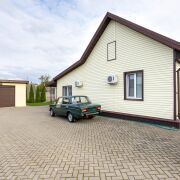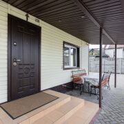 Двор прекрасно облагорожен, есть газон, дорожки выложены плиткой, у входа в дом навес с зоной барбекю.