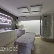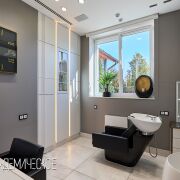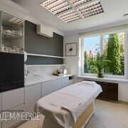 Функциональная постирочная зона оснащена 2 стиральными и 4 сушильными машинами Miele, двумя стерилизаторами для инструментов, системой глажения, столом для ухода за бельём, кондиционером, приточно-вытяжной системой и окном для естественного света.