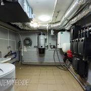 Современная бойлерная: бойлер косвенного нагрева на 300 л с умной системой подмеса (до 500 л тёплой воды), резервный электрический ТЭН 7 кВт, фильтры грубой и тонкой очистки, система умягчения на 20 м³, УФ-обеззараживание воды. Насос Grundfos Scala 2 — тихий, экономичный, с плавным пуском. Всего в системе — 10 насосов для котла, бойлера, подогрева воздуха, радиаторов и полов.