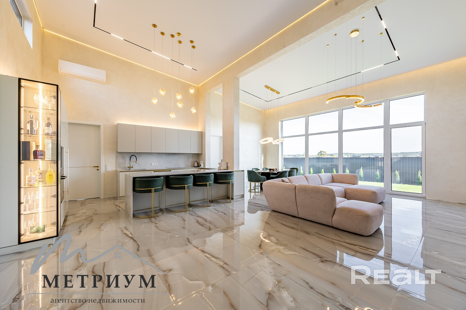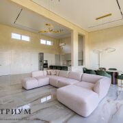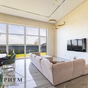 · Просторная кухня-гостиная 67,5 м2 с выходом на участок и видом на лесной массив. А огромное панорамное остекление завораживает. Высота потолков от 4.40 до 5.13 м в главной комнате.