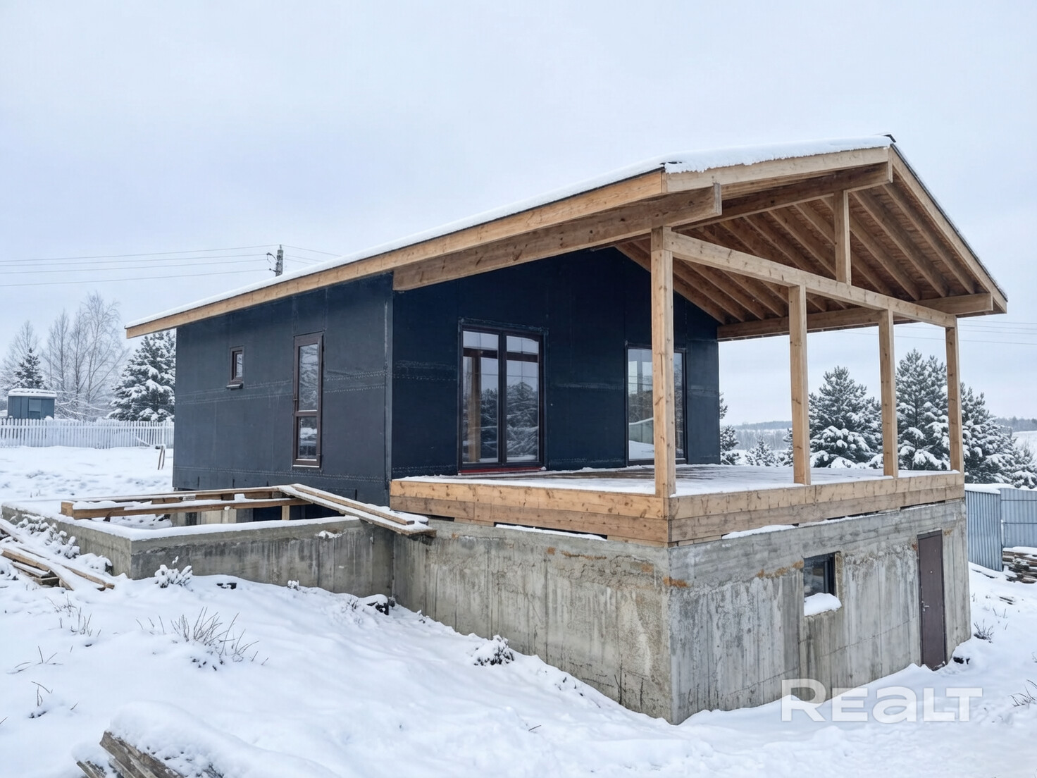 Общая площадь дома — 91 м2, плюс хозяйственное помещение около 26 м2 (на фундаменте 3,6×7,2 м).