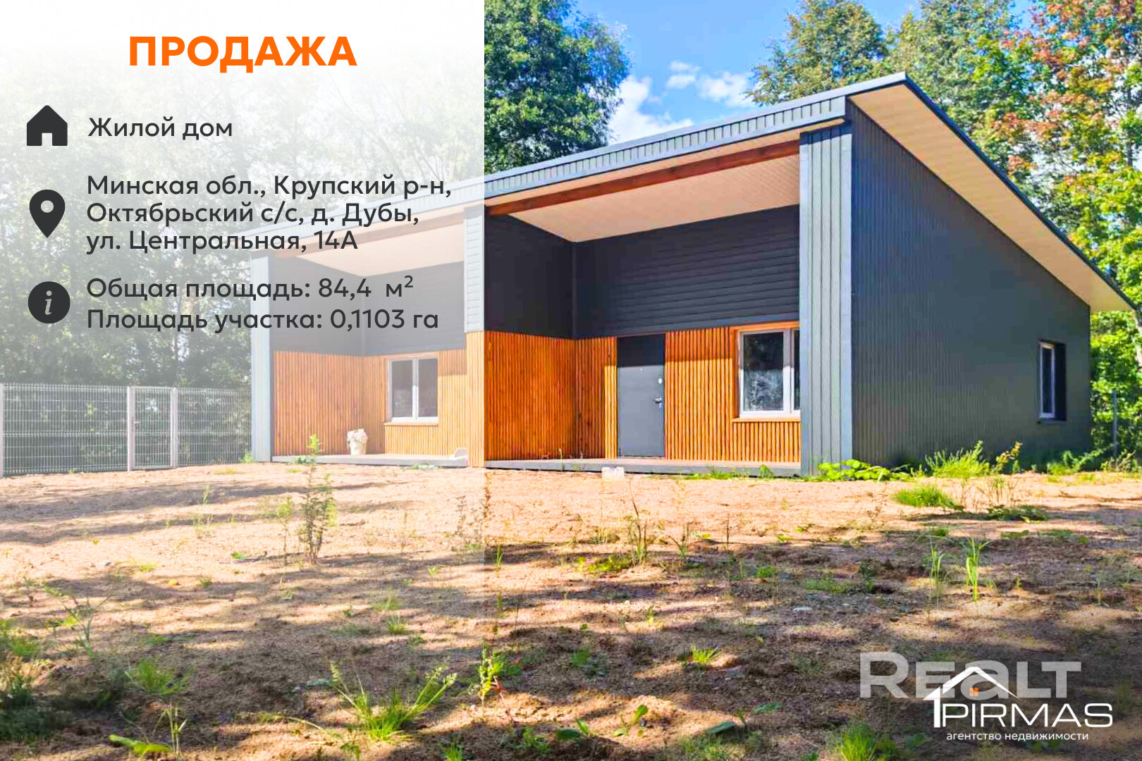 Жилой дом 2025 года постройки площадью 84,4 кв.м расположен в деревне Дубы Крупского района Минской области. Построен из газосиликатных блоков на железобетонном фундаменте, с бетонными полами, металлической крышей, окнами ПВХ и металлическими дверями. Все коммуникации подведены, установлены радиаторы, отопление электрическое, бойлеры в наличии. Дом оштукатурен, участок дренирован и ограждён 3D-еврозабором. Подъездные пути — асфальт. Готов под чистовую отделку.