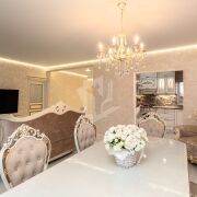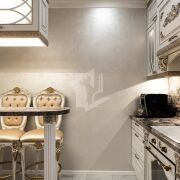 На полу – крупноформатный керамогранит. Роскошный мраморный рисунок придаёт ещё больше объёма пространству.