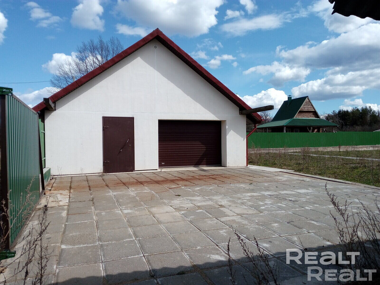 На участке расположен отдельно стоящий гараж 80м2. Фундамент ж/б, материал стен блок газосиликатный оштукатуренный, пол бетонный, крыша шифер ондулин, возможна зарядка электромобиля.