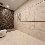 · Просторный санузел, отделанный плиткой, с изысканной мозаикой в душевой и современной инсталляцией.