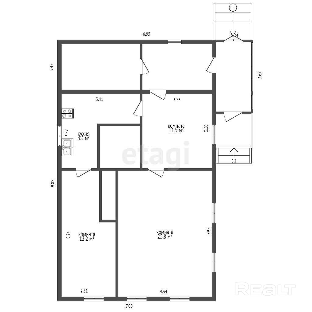 + в доме 3 жилые комнаты 11,5/12,2/25,9 кв.м., кухня 8,3 кв.м. с новой печью и лежанкой