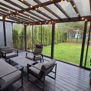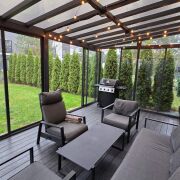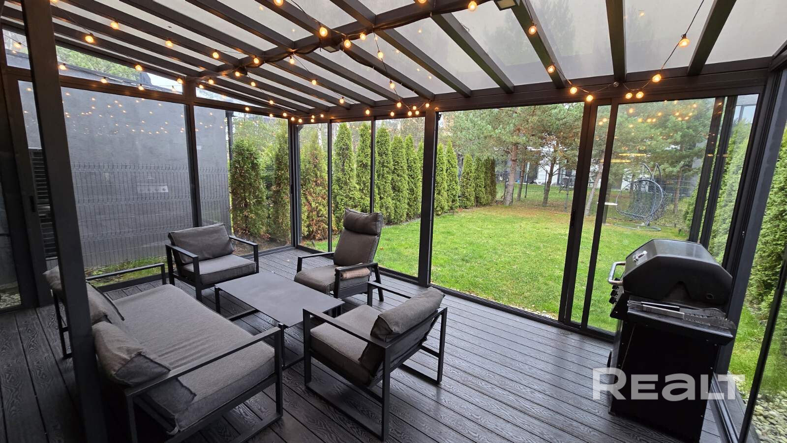 С обратной стороны дома расположена остеклённая терраса (площадью 24м2, укомплектована: террасная мебель, гриль, подвесное кресло) с выходом на собственный участок, по периметру которого высажено 40 туй!