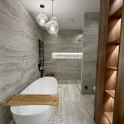 Отдельного внимания заслуживает кухня - фасады из шпона FENIX (Италия), комплектующие Blum, установлена вся необходимая техника: варочная панель,духовой шкаф с функцией микроволновой печи, винный шкаф, холодильник, морозильная камера. Смонтирован тёплый пол. Имеется 8 стульев для большой, дружной компании.
