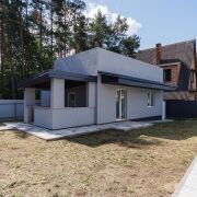 - Построен из газосиликатных блоков 30 см, утеплёние 5 см, выполнена внешняя отделка декоративной штукатуркой. Фундамент свайно-ленточный, пол – бетон.