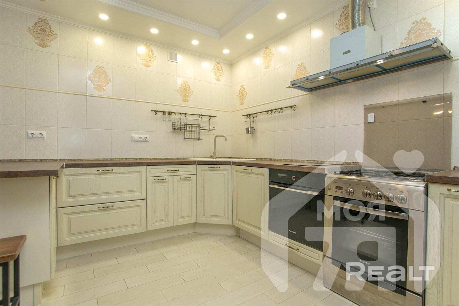 -Кухня выполнена в европейской классике: светлые фасады, качественная фурнитура, продуманная рабочая зона и керамогранитный пол создают ощущение солидности и удобства. Плиточный фартук с декоративными вставками освежает пространство, встроенная техника подчёркивает функциональность, а мягкая подсветка по периметру задаёт атмосферу уюта. Столовая зона с большими окнами наполняет пространство дневным светом и идеально подходит для семейных ужинов или приёма гостей.