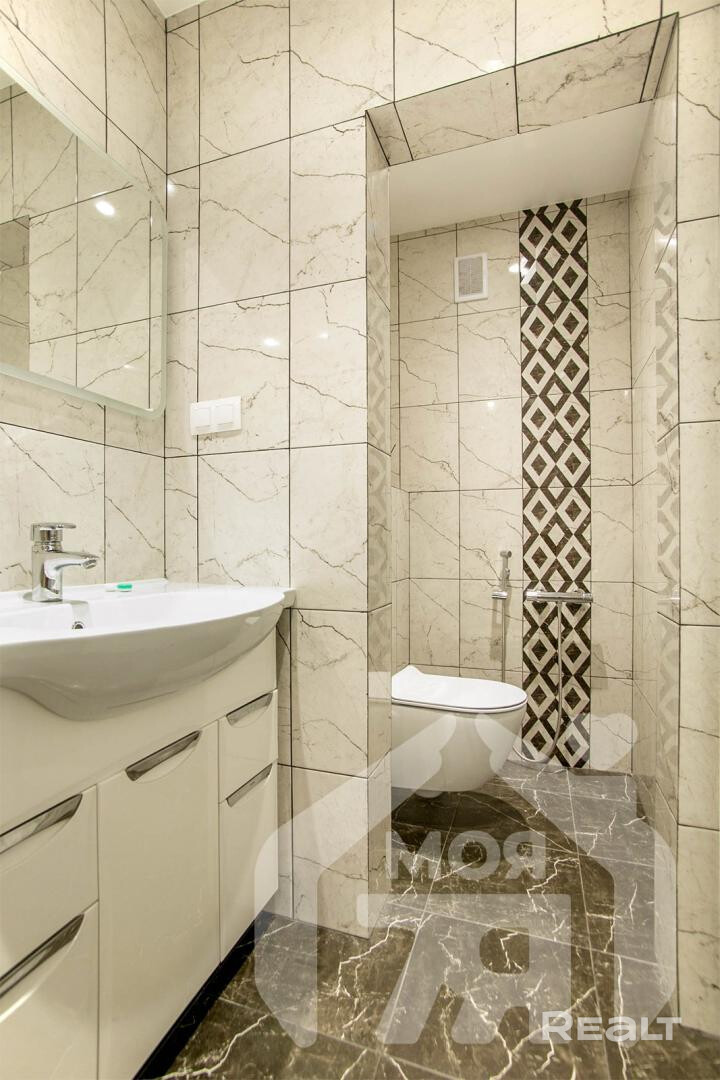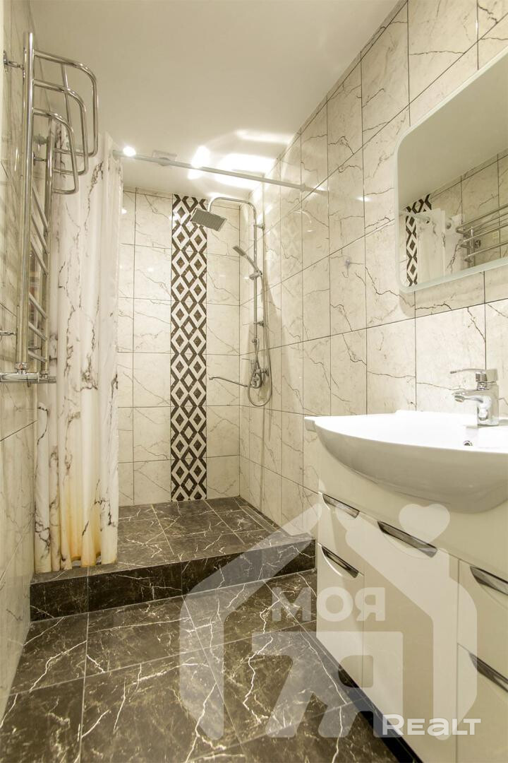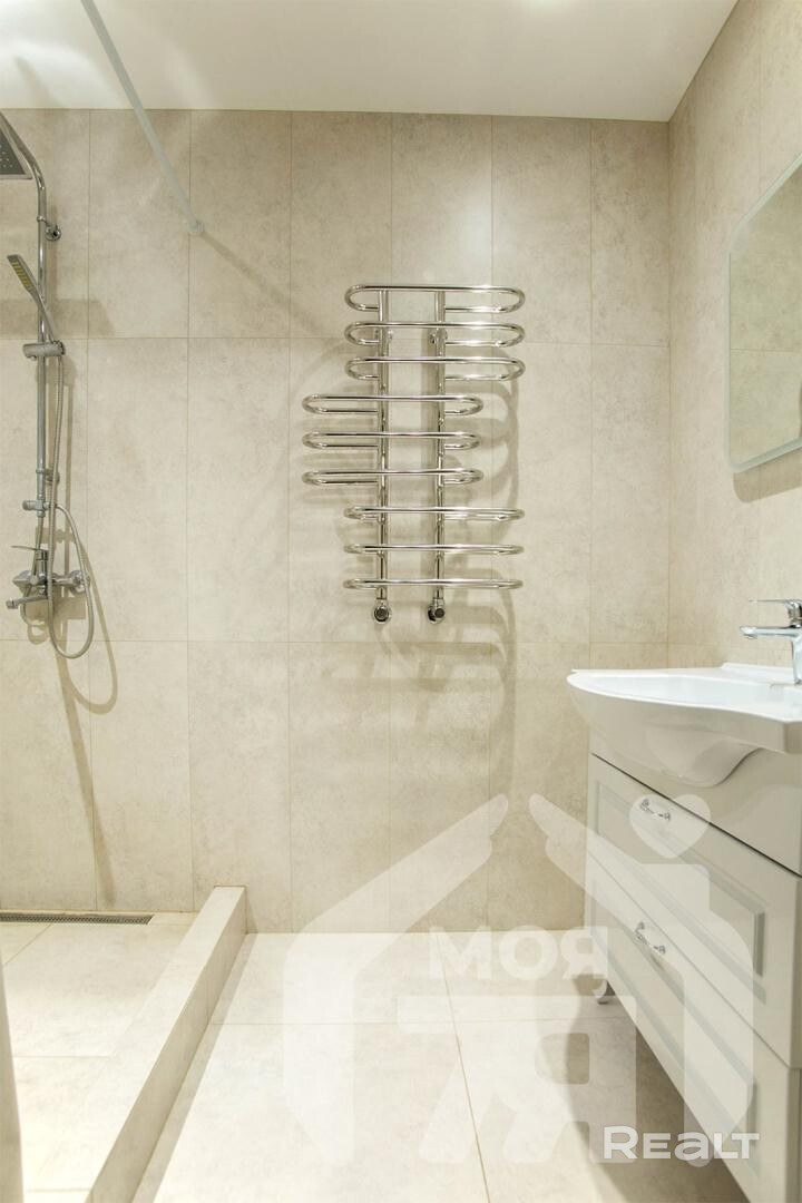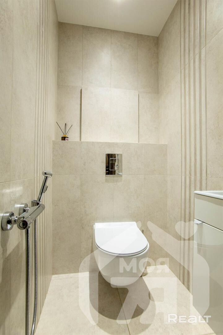 -Санузел оформлен в современном минимализме: плитка в спокойных бежево-серых тонах, душевая, и качественная сантехника - всё говорит о продуманности и внимании к деталям.