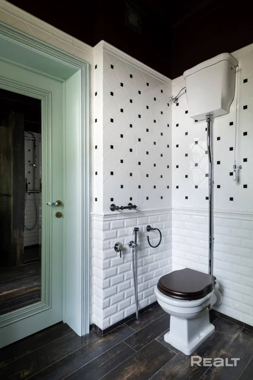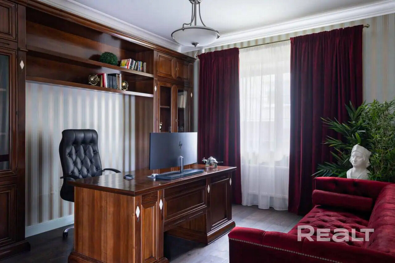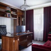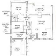 Кухня из массива дерева и паркетная доска создают атмосферу тепла и комфорта( тёплые полы). Здесь же расположена гостевая спальня, кабинет и один из трех санузлов.