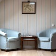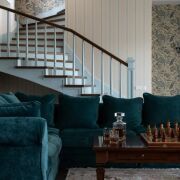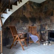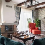 В гостиной расположен большой модульный диван рядом с камином, из гостиной есть выход на террасу, где можно наслаждаться свежим воздухом и живописными видами.