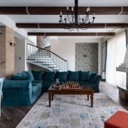 На первом этаже вас встретит просторная гостиная с качественной мебелью, изготовленной в Италии, всей техникой SMEG, плитка Скривел и деревянные стеклопакеты.