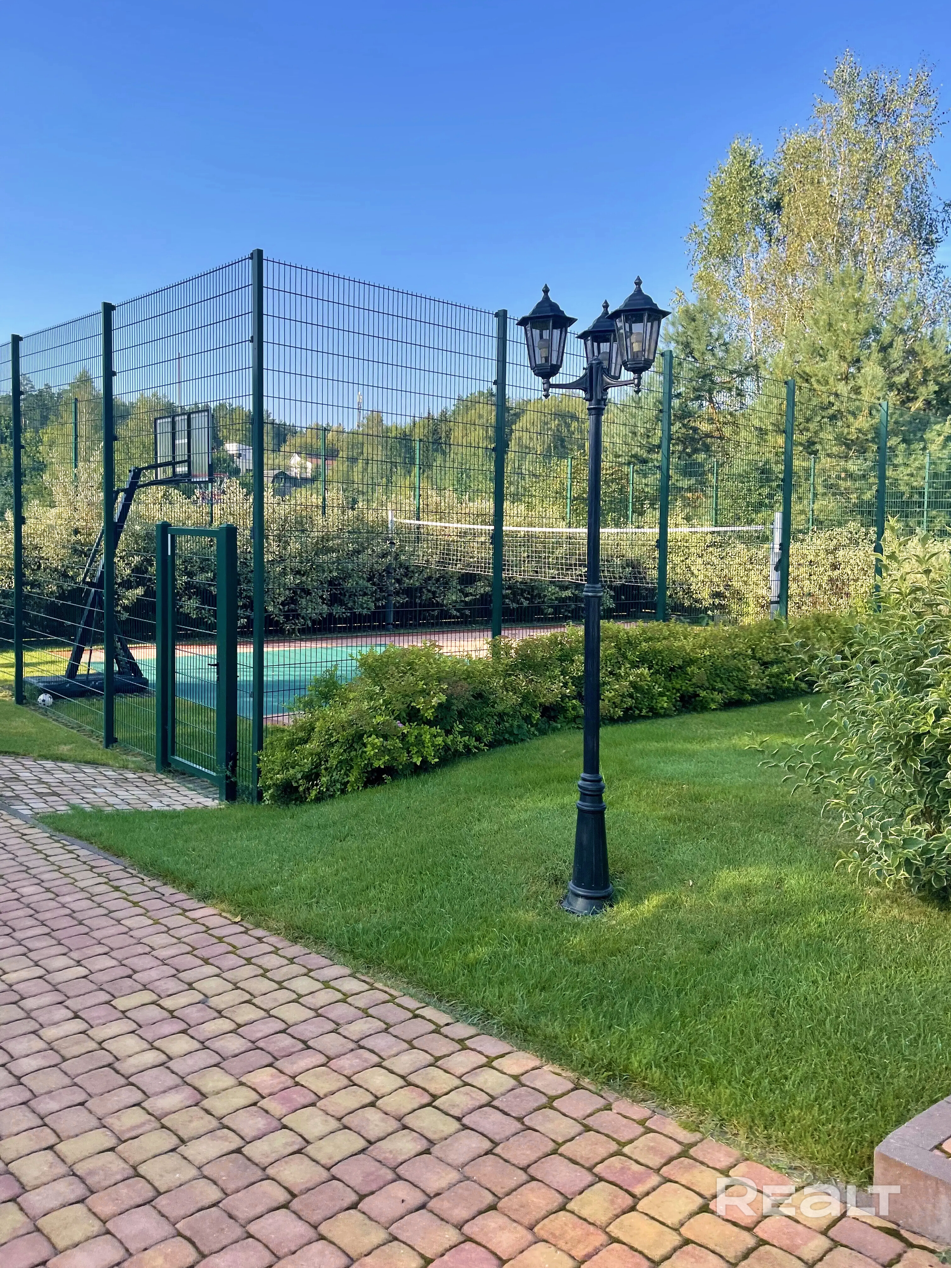 Здесь есть волейбольный корт и корт для большого тенниса, что позволит вам активно проводить время на свежем воздухе. Автополив газона обеспечит всегда ухоженный вид территории, а плодовые деревья и кусты добавят уюта и красоты вашему участку. Особое внимание заслуживает аллея вдоль водоёма, расположенная рядом с домом.
