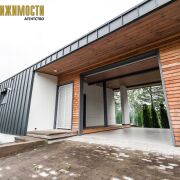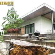 Фасад: вентилируемая система — оцинкованные фальцевые панели + фиброцементные панели + лиственница.