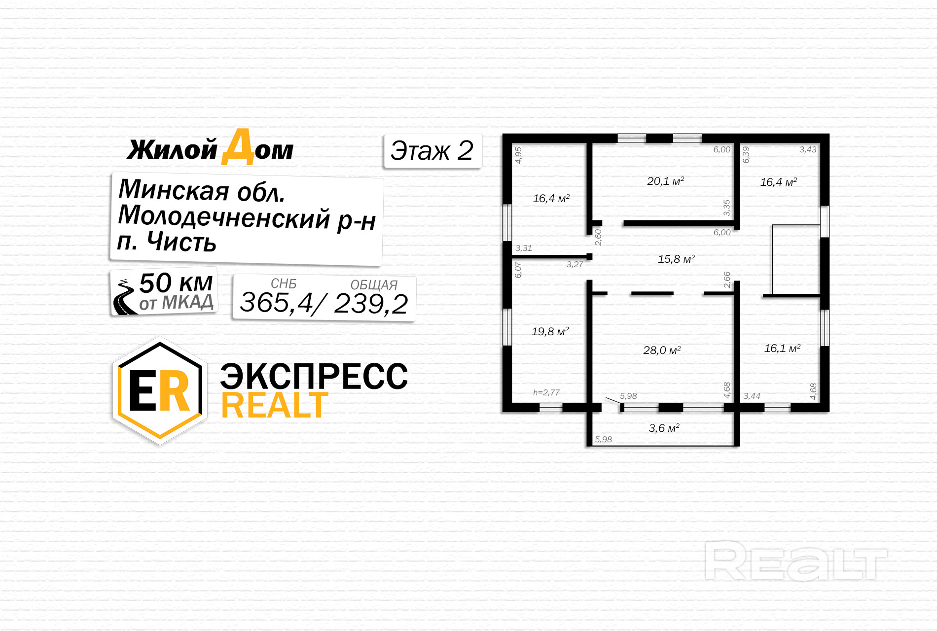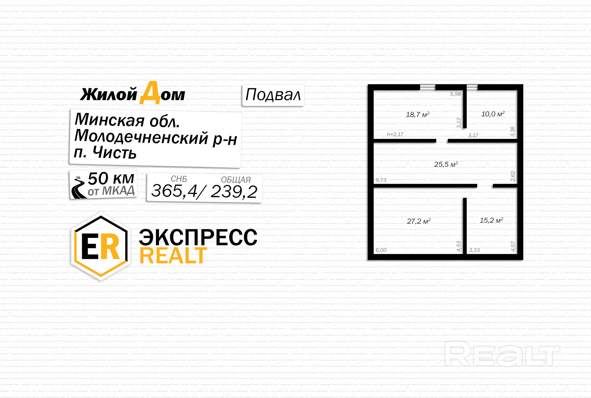 Площадь дома по СНБ-365,4 м², общая площадь — 239,2 м². Под отделку. Гараж в доме. Все коммуникации разведены: электричество, центральный водопровод, канализация местная, природный газ. Отопление паровое на газу (новый котел). Земельный участок площадью 17,19 сотки, в пожизненно наследуемом владении. Территория обустроена и ухожена. ООО «Экспресснедвижимость-риэлт», УНП 193505113, лицензия №02240/409 от 05.03.2021 г., договор на оказание риэлтерских услуг № 358/1 от 22.06.2023 г.