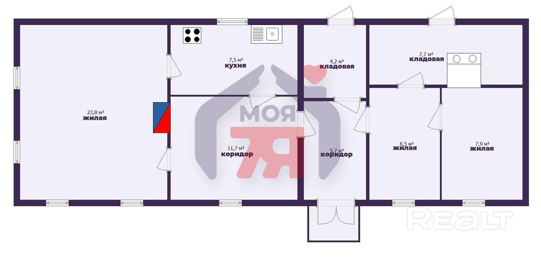 - Планировка включает несколько жилых помещений, кухню и кладовые - всё удобно и функционально. При желании можно обновить интерьер или расширить жилое пространство: площадь и конструкция дома позволяют это сделать без сложных переделок.