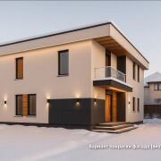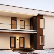 Главный дом 218 м2: Современная архитектура, плоская кровля, панорамные окна от бренда Salamander (76 мм). Высота потолков — почти 3 метра, что создает ощущение простора и свободы.