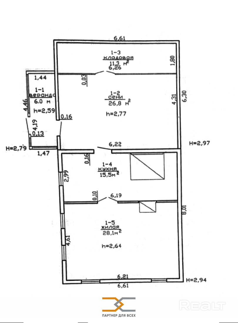 В доме одна жилая просторная комната общей площадью 28,1 м.кв., кухня площадью 15,5 м.кв. Окна крепкие деревянные. В доме две печки. Фундамент высокий. Входная дверь металлическая. На чердаке мусора нет, стропила крепкие. Дом выполнен из качественного бруса, нижние венцы крепкие менять не нужно.