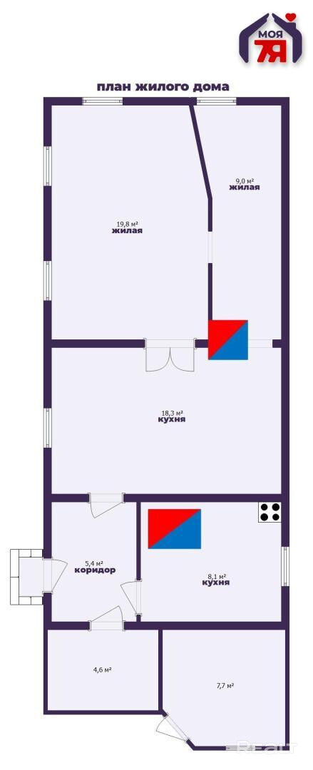 - Бревенчатый одноуровневый дом с двумя жилыми комнатами и косметическим ремонтом.