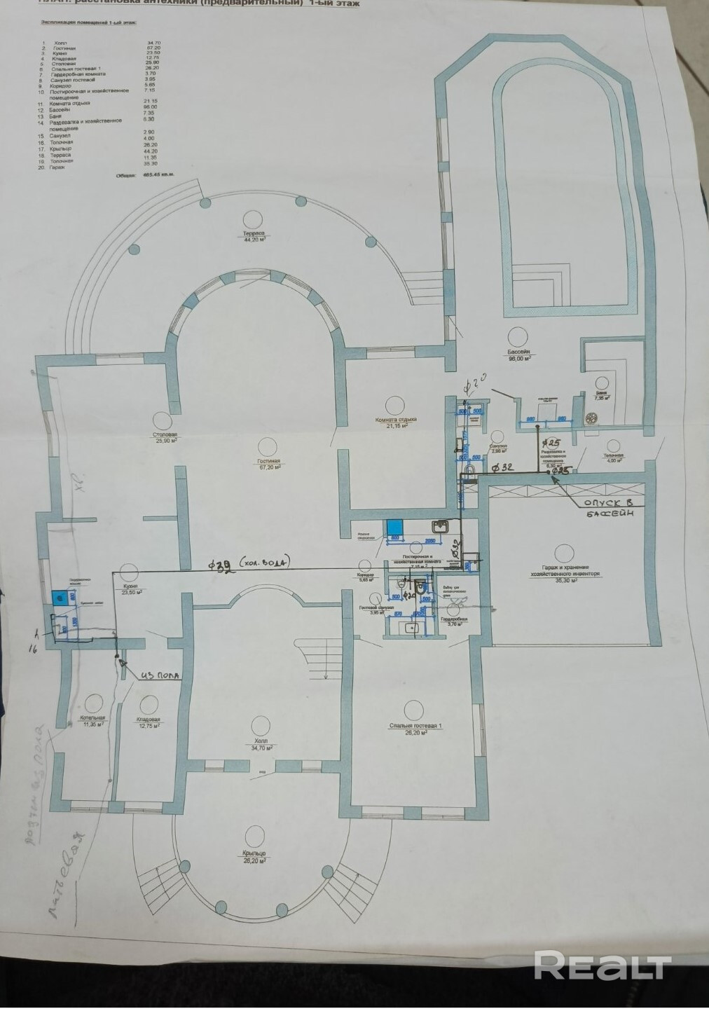 - 1-й этаж – спальня 26 м2, гостиная 67 м2, кухня + столовая (23,5 и 25,90 м2), санузел, постирочная, комната отдыха, бассейн, баня, санузел и т.д.